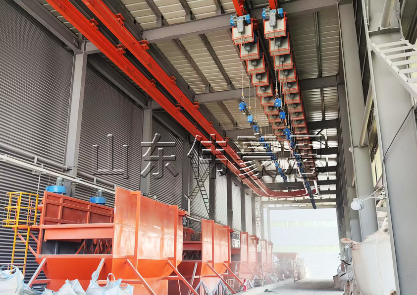鋰精礦運輸車從車道進入卸車位置后停止,環(huán)形單軌吊吊裝葫蘆自動運行到貨車車廂頂上,兩人員分別遙控落下各環(huán)鏈吊裝葫蘆掛鉤,人員進行掛噸袋,掛噸包帶結束后按下脫鉤器位置的運行按鈕,進入自動運行模式,吊裝葫蘆裝置自動升起一定高度,并自動前行至自動破包機破袋裝置上方,根據預設程序,吊裝葫蘆到位后自動下落,自動進行破噸袋,破袋結束后,自動發(fā)指令給吊裝葫蘆裝置,自動上升并行走到空袋清理裝置進行空袋清理,駛離自動破包機到達脫袋位置,自動脫鉤器自動脫落空的噸袋至廢袋打包機,進行廢袋的自動打包捆扎;隨即吊裝葫蘆裝置自動駛離脫袋位置,自動運行到運輸車上方,等待人員操作,進行下一輪操作。